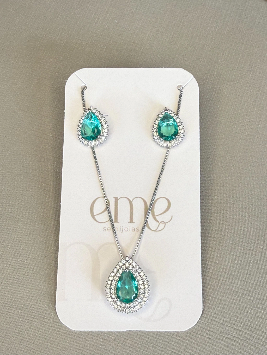 Conjunto Gota Verde Cravejado Banho Ródio